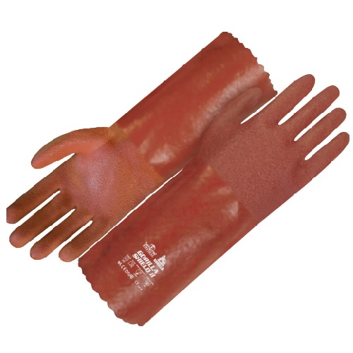 • Heavy-duty double-dipped PVC chemical gloves providing excellent protection against acids, bases, oils, and industrial chemicals.