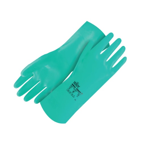 • High-quality nitrile chemical-resistant gloves designed for handling acids, solvents, oils, and other industrial chemicals.