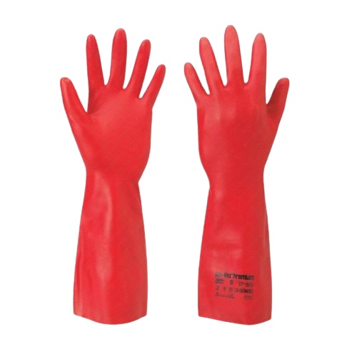 Heavy-duty chemical-resistant gloves designed to protect hands and forearms during exposure to industrial chemicals, oils, solvents, and cleaning agents.